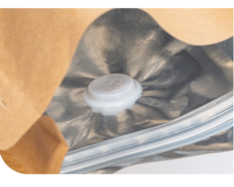 單向排氣閥可將二氧化碳排出袋外,并阻止袋外的氧氣進(jìn)入袋內(nèi)(空氣會氧化咖啡豆,使咖啡香氣揮發(fā),改變咖啡風(fēng)味)??諝忾y可確??Х鹊男迈r度和質(zhì)量。